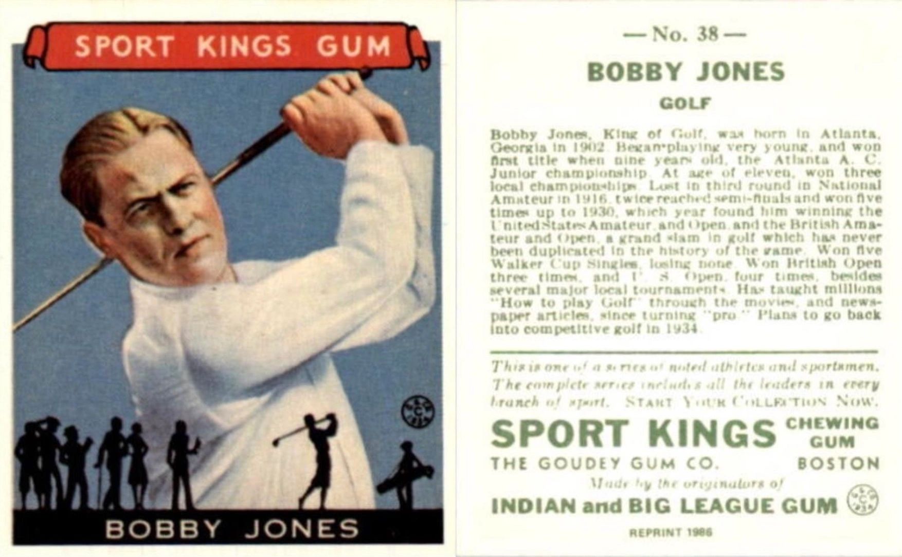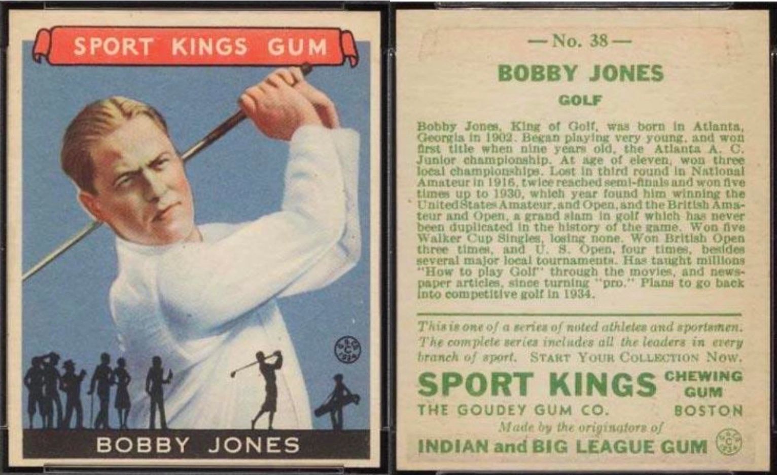 To know the differences between authentic cards and the 1933 Goudey Sport Kings reprints, let us compare the original #38 Bobby Jones card from the reprint Bobby Jones card.