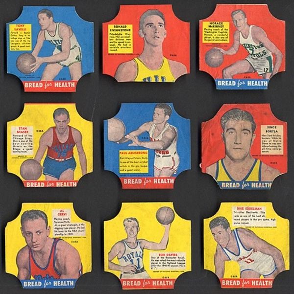 There are 32 different basketball cards in the set from 12 different NBA teams. In fact, it is arguably the first true NBA set as it came out after the Basketball Association of America merged with the National Basketball League on August 3, 1949. The labels appeared on the end of National Baking Company bread loafs. They were only issued during basketball season, and only in limited regional areas, so you can see why the are so hard to find.