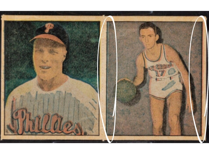 Photo Sync issues happen when the photograph and background are misaligned. Specifically, the photo of the player should be in sync with its background color. A 1951 Berk Ross card that has a photo sync problem has a blurry image with discolored skin, and you can see one or more colors bleeding onto an edge. See below.