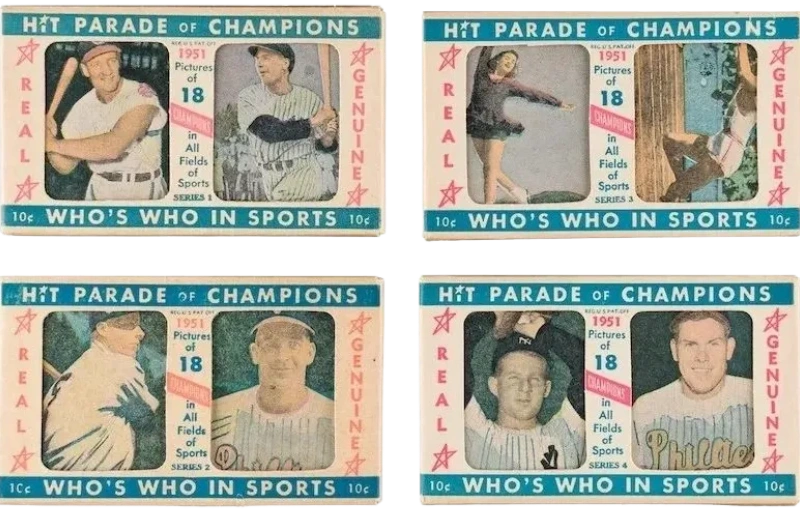 The "Hit Parade of Champions" baseball set from 1951 by Berk Ross contains 72 cards that feature a variety of sports, including football, basketball, boxing, golf, figure skating, and the Olympics. Hall of Famers Phil Rizzuto (#1-3), Stan Musial (#2-1), Larry "Yogi" Berra (#2-4), Joe DiMaggio (#2-5), and Eddie (Whitey) Ford (#4-5) are significant contributions to this special set.