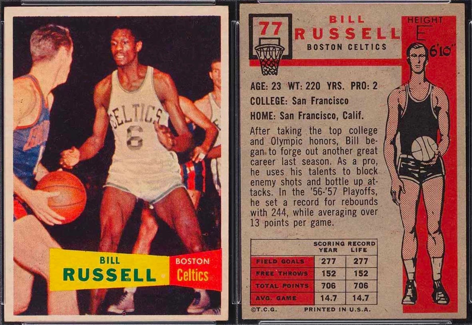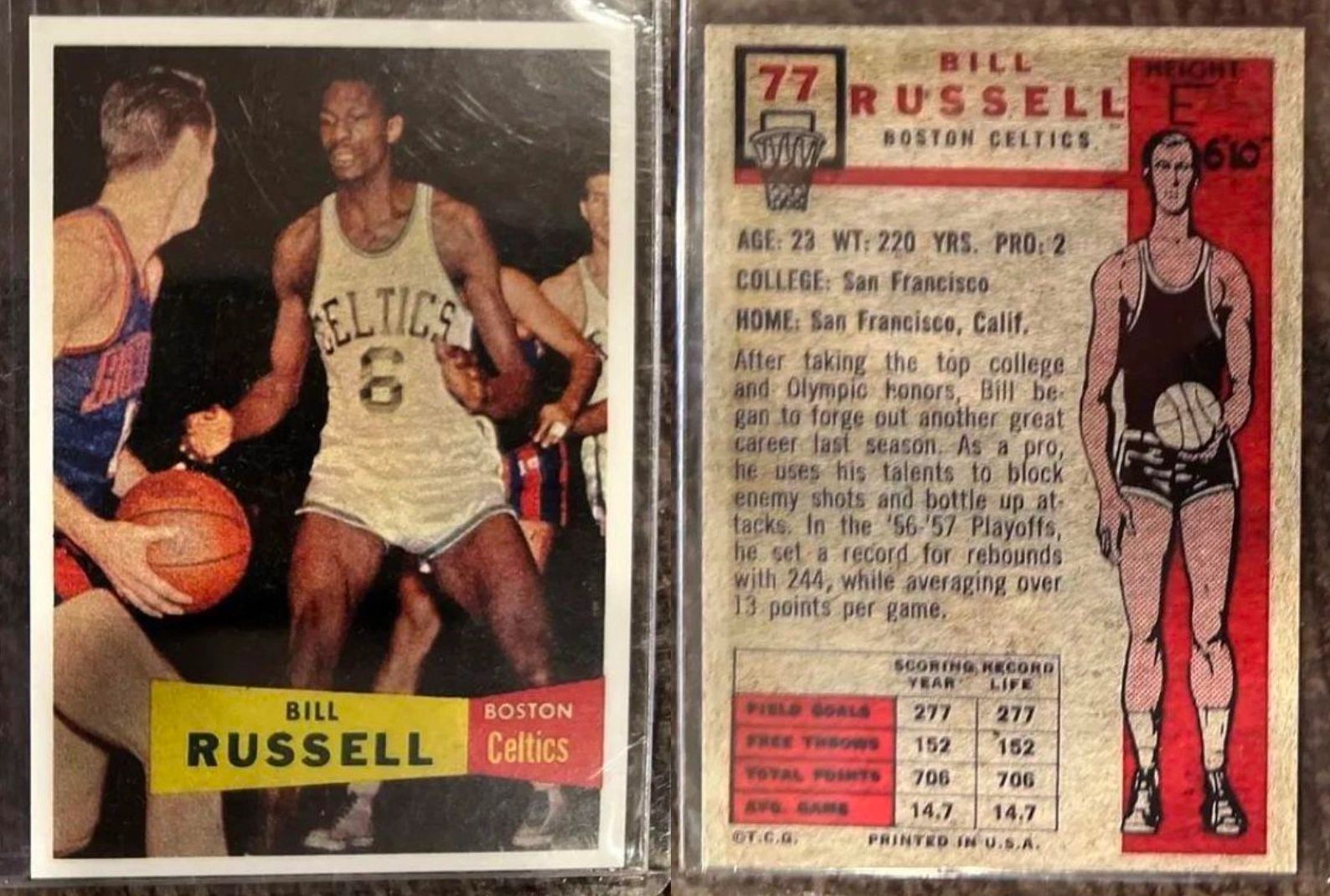 To know the differences between authentic cards and the 1957 Topps reprints, let us compare the original #77 Bill Russell card from the reprint Bill Russell card.