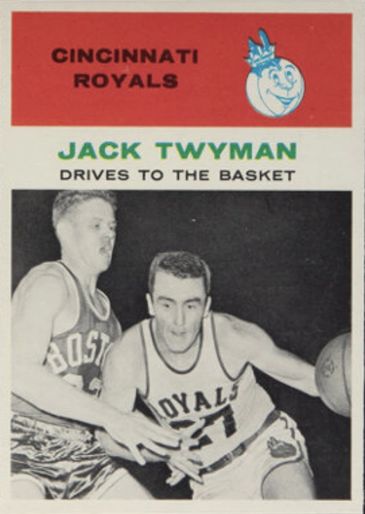 The promo version of the Twyman IA card contains a different photograph but includes the same "Drives To The Basket" phrase. Here, Twyman is guarded by Boston Celtics Tom Heinsohn #18. Interestingly, Twyman is wearing his official #31 jersey number in the promo card but #37 in the officially released card (left).